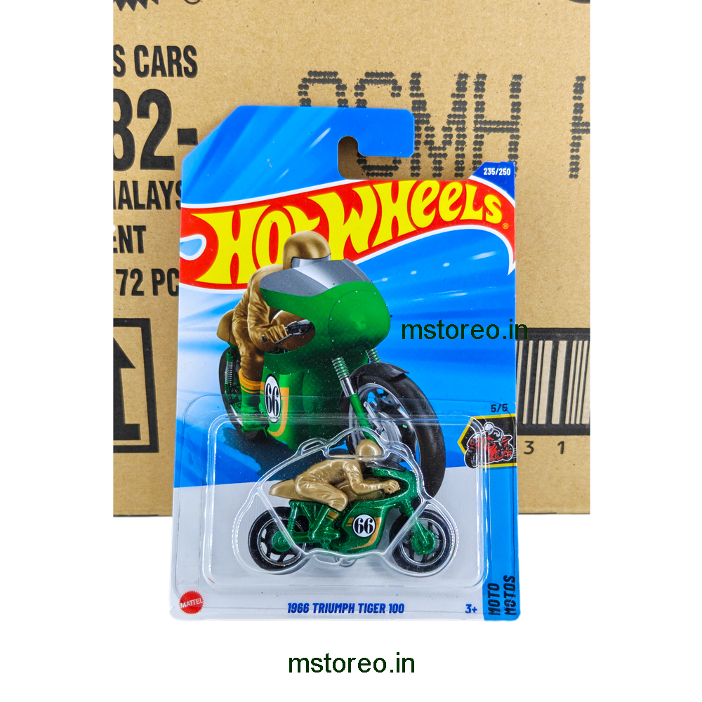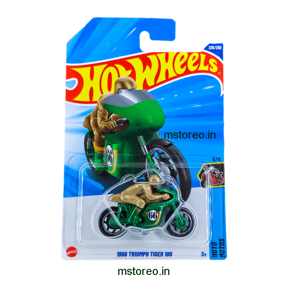 Buy the Hot Wheels 1966 Triumph Tiger 100 die-cast motorcycle, a legendary British vintage bike in 1:64 scale. Perfect for Hot Wheels collectors, motorcycle enthusiasts, and classic bike fans.