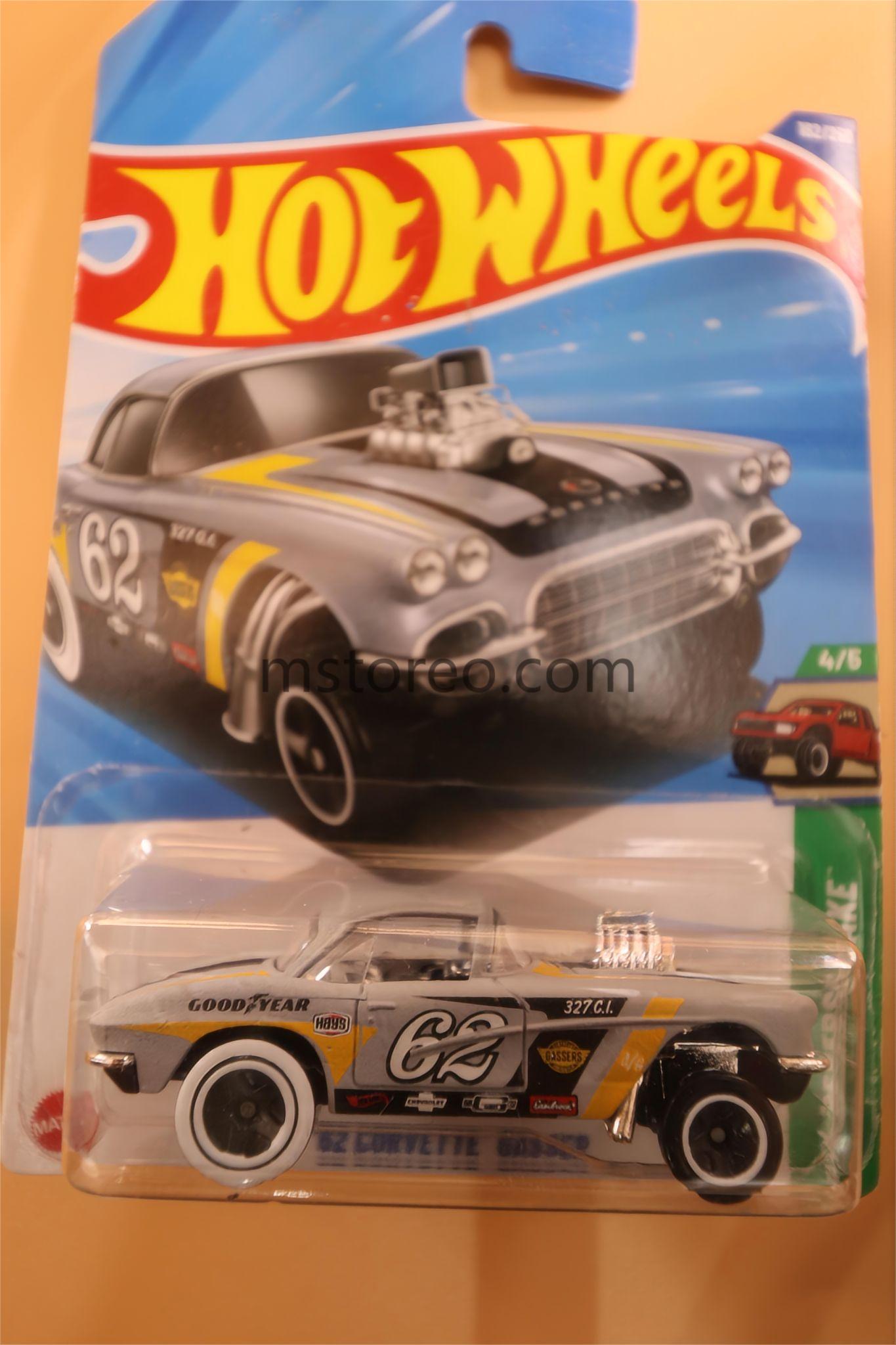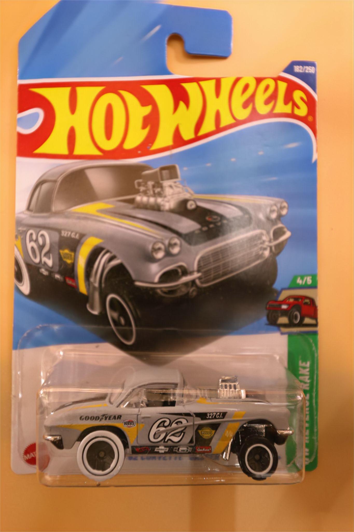 Experience the thrill of classic American muscle with the Hot Wheels ’62 Corvette Gasser. This stunning collector’s piece showcases a shimmering silver finish, authentic racing decals, and a meticulously detailed exposed engine, capturing the spirit of high-speed drag racing. Measuring approximately 1:64 scale (about 3 inches in length), this die-cast beauty is perfect for display or revving up your Hot Wheels collection. Ideal for car enthusiasts and collectors seeking an eye-catching, high-performance model.