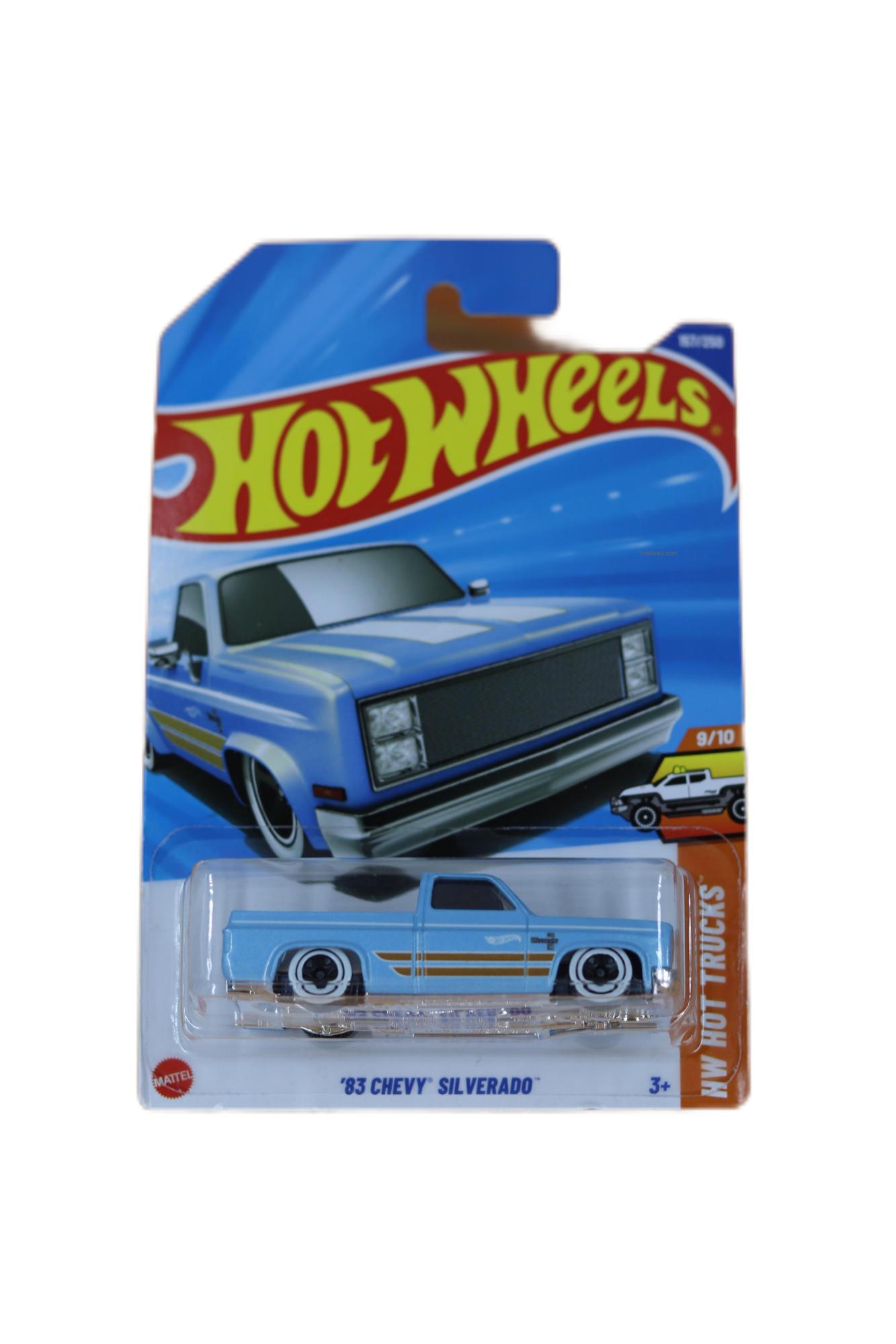Buy Hot Wheels ’83 Chevy Silverado 1:64 die-cast pickup truck. Classic 1983 Chevrolet Silverado model with premium detailing for collectors.