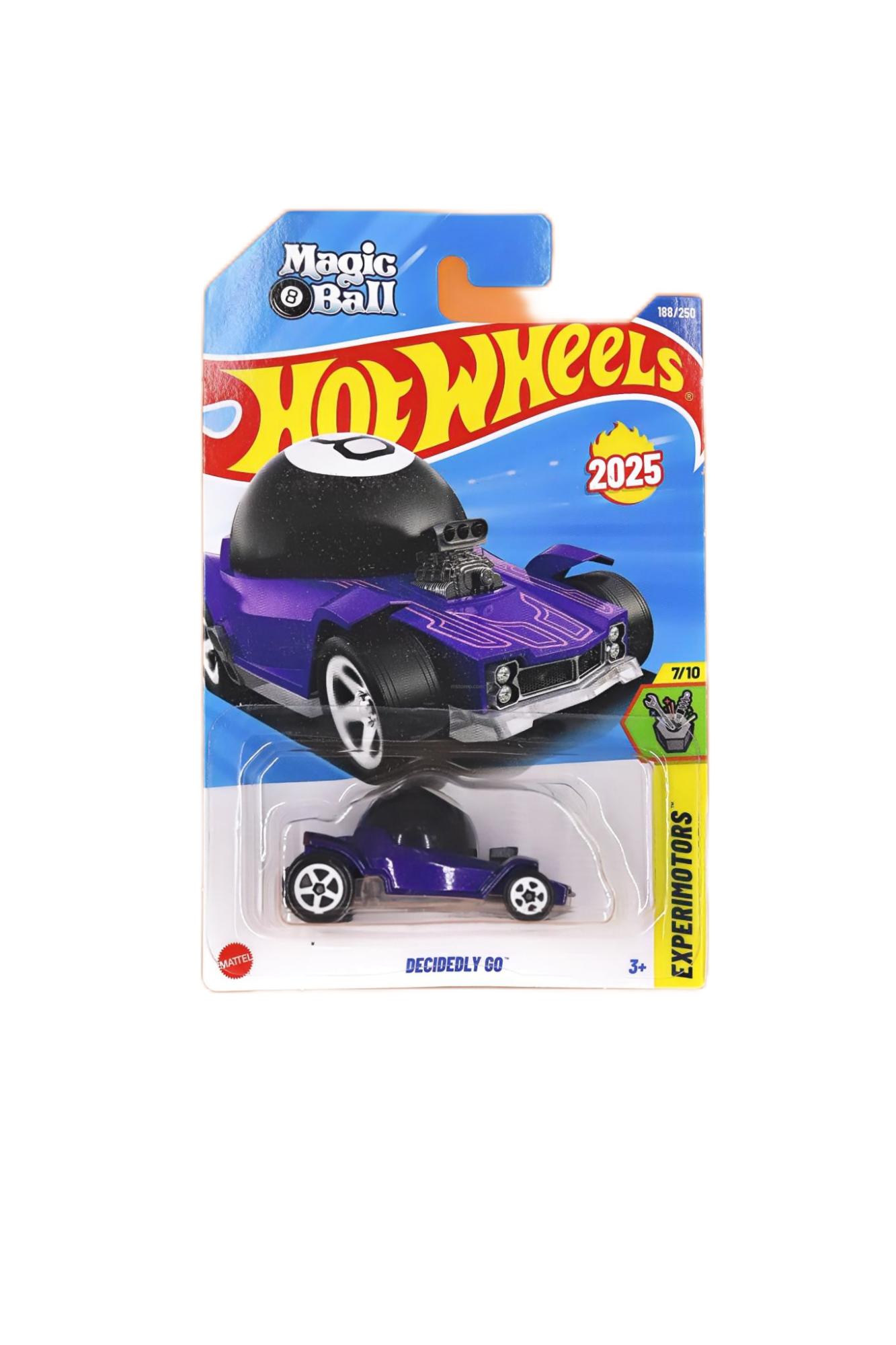 Unleash the excitement of surprise and speed with the Hot Wheels Magic 8 Ball Decidedly Go! die-cast car. Featuring a striking black and purple finish inspired by the iconic Magic 8 Ball, this collectible model is part of the thrilling Experimotors series. Crafted with precision and vibrant details, it measures approximately 1:64 scale—perfect for racing, display, or imaginative play. Designed for ages 3 and up, it makes an unforgettable gift for young fans and collectors alike. Add a touch of mystery to your Hot Wheels collection today!